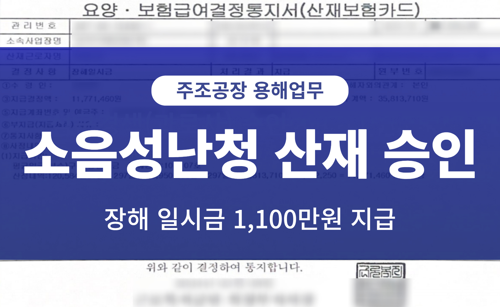 주조공장 용해업 근로자에게 발생한 소음성난청 산재 승인 사례 산재보상센터 소음성 난청 0 1272 2025-08-20 1. 인적사항 성별: 남성나이: 61년생 직종: 주조공장 용해업무 2. 재해경위 근로자는 약 13년 동안 자동차 차체용 부품을 만드는 주조공장에서 용해업무룰 담당하였습니다.순음청력검사결과 청력 손실치가 우측: 55dB, 좌측: 65dB인 감각신경성난청을 진단받았습니다. 3. 결과재해자는 과거력상 이질환력, 약물복용력, 두부나 외상 등의 특이 이상병력은 없었으며퇴직 전 평균임금을 반영하여 장해 10급에 해당하는 장해보상일시금을 수령하였습니다.