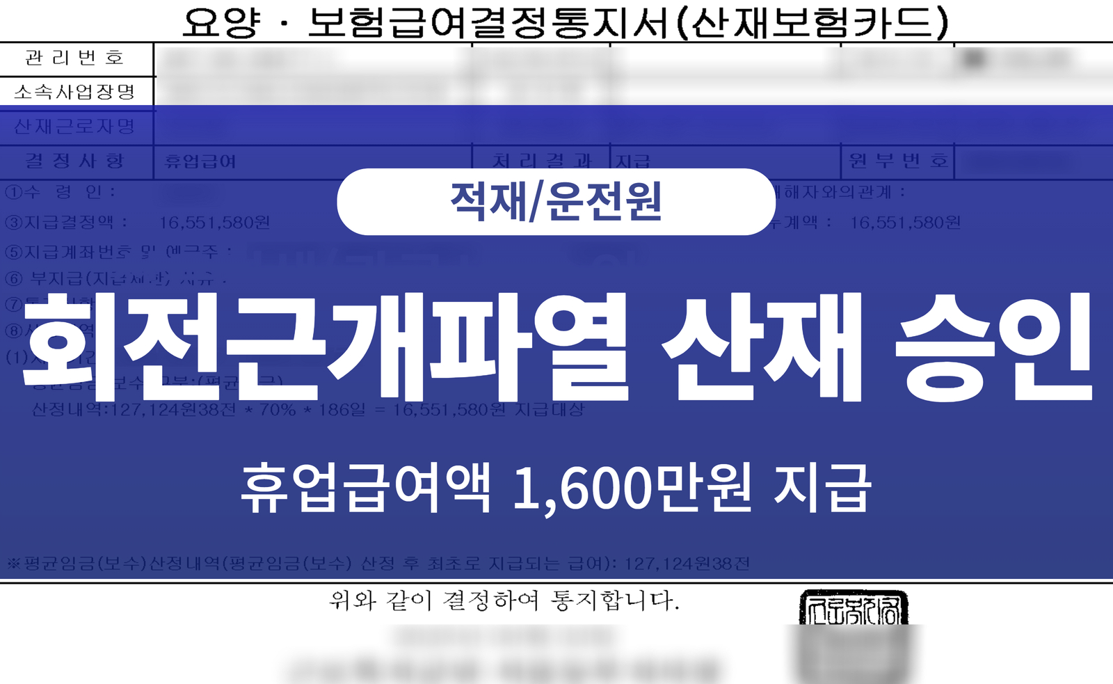 배달 근로자의 회전근개파열 산재 승인 사례 산재보상센터 근골격계 질병 0 896 2025-09-23 1. 인적 사항 성별 : 남성나이 : 43세직종 : 배달 근로자 2. 재해 경위 재해자는 배달원으로 퇴근하던 길에 차를 받는 사고를 당했습니다.이후 응급 내원하여 진료를 받았으며 우측 어깨의 회전근개의 근육 및 힘줄의 손상,기타 및 상세불명의 손상 진단을 받았습니다. 3, 결과 급여명세서, 근로임금계약서, 근태자료 등 이에 해당하는 입증 자료들을 제출하여업무상 재해임을 인정받아 요양급여, 휴업급여 승인되었습니다.