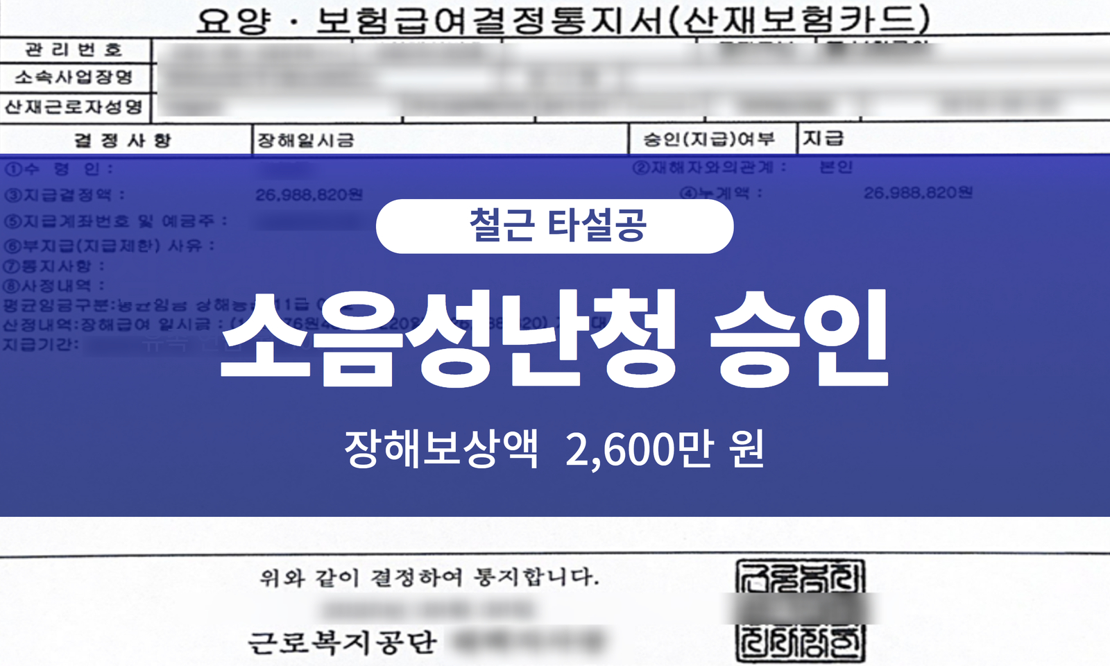 철근 타설공에게 발생한 소음성난청 장해 보상 사례 산재보상센터 소음성 난청 0 649 2025-11-24 1. 인적사항 성별 : 남성나이 : 49년생직종 : 철근타설공 2. 재해경위 재해자는 철근타설공으로 11년 8개월 근무하였습니다.소음 사업장에서 오랫동안 근무하여 잘 들리지 않는 증상으로 병원에 내원한 결과,양측의 감각신경성 난청을 진단받았습니다. 3. 결과 양측 감각신경성난청으로 노인성 난청의 영향이 비교적 적은 연령 65세이며,소음에 노출되는 작업 등을 고려할 때 재해자의 난청은 소음 작업과 관련 있을 것으로인정되었습니다. 따라서 장해 11급에 해당하는 장해 일시금을 보상받을 수 있었습니다.
