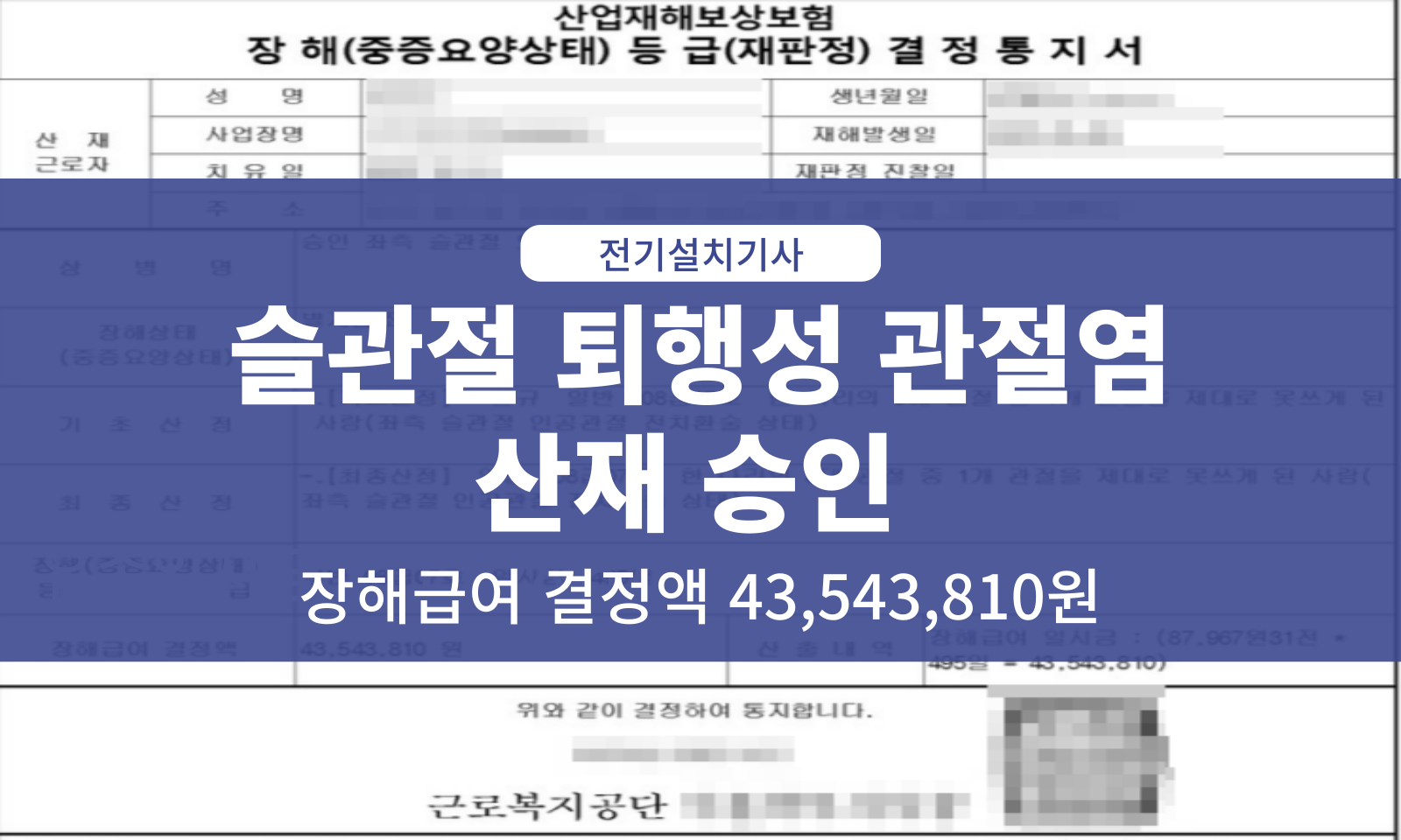 전기설치기사 슬관절 퇴행성 관절염 산재 승인 산재보상센터 근골격계 질병 0 685 2025-12-15 1. 인적사항성별: 남성나이 : 67직종 : 전기설치기사2. 재해경위근로자는 33년간 건설 현장의 전기설치 기사로 근무하였습니다,무릎 통증으로 인해 병원을 찾았고, 좌측 슬관절 퇴행성관절염을 진단받았습니다.이에 부적절한 자세, 양중작업, 진동작업 등약 33년간의 무릎에 부담이 가는 신체부담업무 수행으로 인해 발생한업무상 질병이라고 주장하였습니다.3. 결과 위 내용을 기반으로 접수 이후 요양급여 승인되었고근로자의 장해등급 8급으로 결정되었습니다.