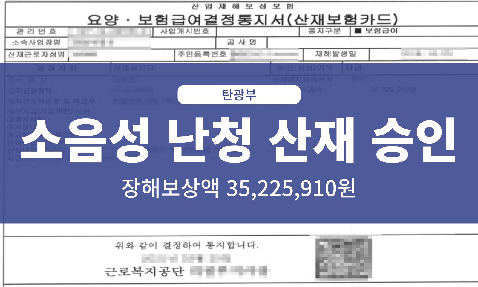 탄광부의 소음성 난청 산재 승인 사례 산재보상센터 소음성 난청 0 1435 2025-12-26 1. 근로자 인적사항 성별 : 남 직종 : 탄광부 근무기간 : 16년 2. 재해경위 근로자는 약 16년간 탄광에서 굴진, 선산부로 근무하면서 상시적으로 장시간 강한 소음에 노출되는 작업을 수행하였습니다.퇴직 후 이비인후과에 내원하여 청력검사를 한 결과 “양측 감각신경성 청력소실, 소음성 난청” 진단을 받고 산재보상을 청구하였습니다. 3. 결과저희 법인에서는 재해자의 난청이 업무로 인해 발생한 업무상 질병이라는 사실을 주장하였고,공단에서는 재해자의 난청을 산재 승인하여,장해등급 제11급으로 결정되었습니다.